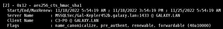 The first part is one we are interested in since it can be cracked in order to potentially retrieve the service account’s password.