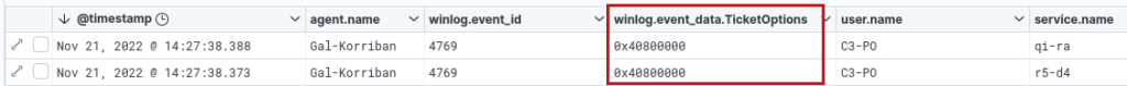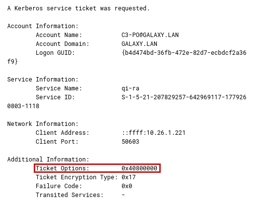 Unusual or unknown ticket options4769 – KerberosTicket Options fieldThe ticket options of certain tools are quickly recognizable, such as those of GetUserSPNs.py from the impacket suite