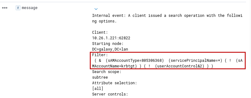 • Monitor events with ID 1644 by filtering on the servicePrincipalNames=* string of the LDAP request. Although theoretically possible, rules based on LDAP Windows events are rarely implemented because the volume of LDAP logs to be collected is very large (Alternatives are emerging, with commercial solutions such as Microsoft Defender for Identity, or custom rules implemented on endpoint security solutions)