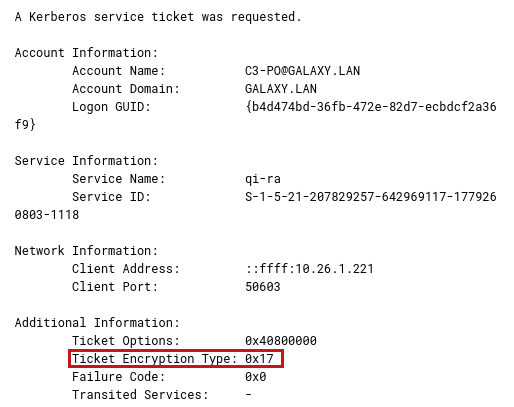 In events with ID 4769, we can also see the encryption algorithm used (the Ticket Encryption Type field):