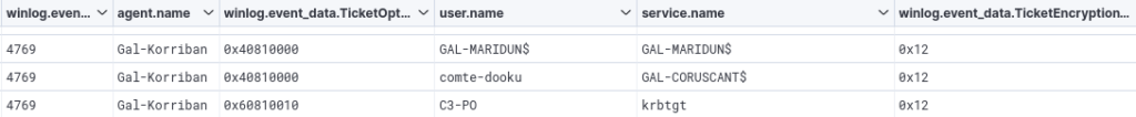 • In addition, querying a large number of tickets in a very short time will generate many events with ID 4769: