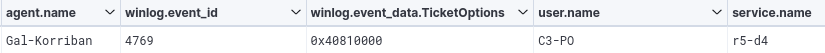 A final element to be observed in this attack is the ticket request options. Ticket requests made during a Kerberoast attack with the Rubeus tool have the following option string in the `TicketOptions` parameter: