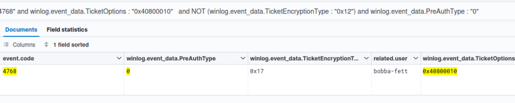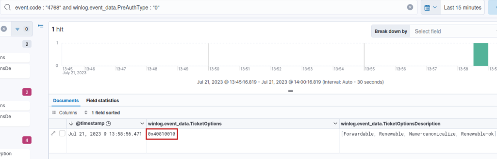 From our internal tests and the result given by the Intrinsec’s SOC, the most common ticket options obtained following a legitimate TGT request is : [Forwardable, Renewable, Name-canonicalize, Renewable-ok] (0x40810010) while Rubeus request generate a TGT with [Forwardable, Renewable, Renewable-ok] (0x40800010) options. Filtering on this value can then be interesting, even if we don’t recommend using it stand-alone because numerous false-positives could be obtained: