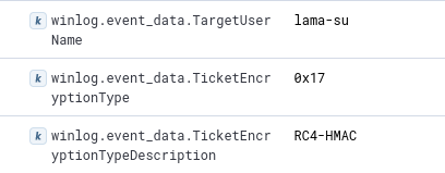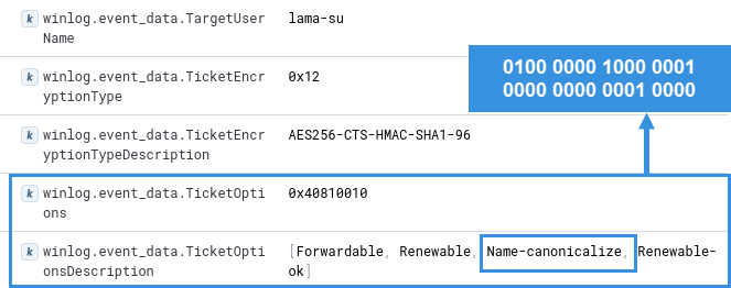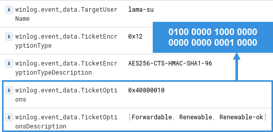 Unusual or unknown ticket options4768 – Kerberos – TGT was requestedField Ticket optionsThe ticket options of some tools are quickly recognizable. Rubeus: 0x4080001