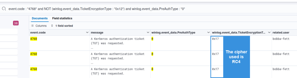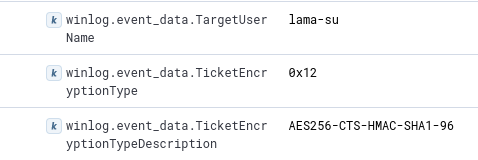 Encryption downgrade4768 – Kerberos – TGT was requestedField TicketEncryptionType!=0x12TGTs are legitimately requested encrypted using the AES256 encryption algorithm. Any generation of TGT encrypted using another cipher should be monitored.