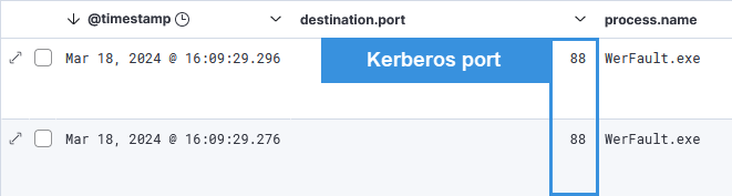For example, during the Fork and Run process (execute-assembly feature in Cobalt Strike), the Rubeus tool is executed within the process defined by the spawnto command, in this case werfault.exe. Kerberos traffic is then carried out from the werfault.exe process: