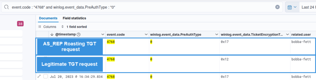 Large number of TGT tickets requested in a short amount of time4768 – Kerberos – TGT was requestedField PreAuthType=0Successive TGT requests for users who don’t have the enforced Kerberos preauth is not legitimate behavior.