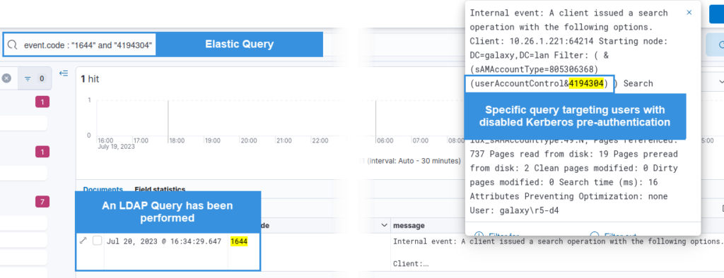 LDAP request used to list users without enforced Kerberos pre authentication1644 – LDAPLDAP filter userAccountControl&4194304An LDAP query with this filter will only occur if accounts without Kerberos preauth enforced are listed, which should never happen outside of AS_REP Roasting attacks or planned maintenance actions.